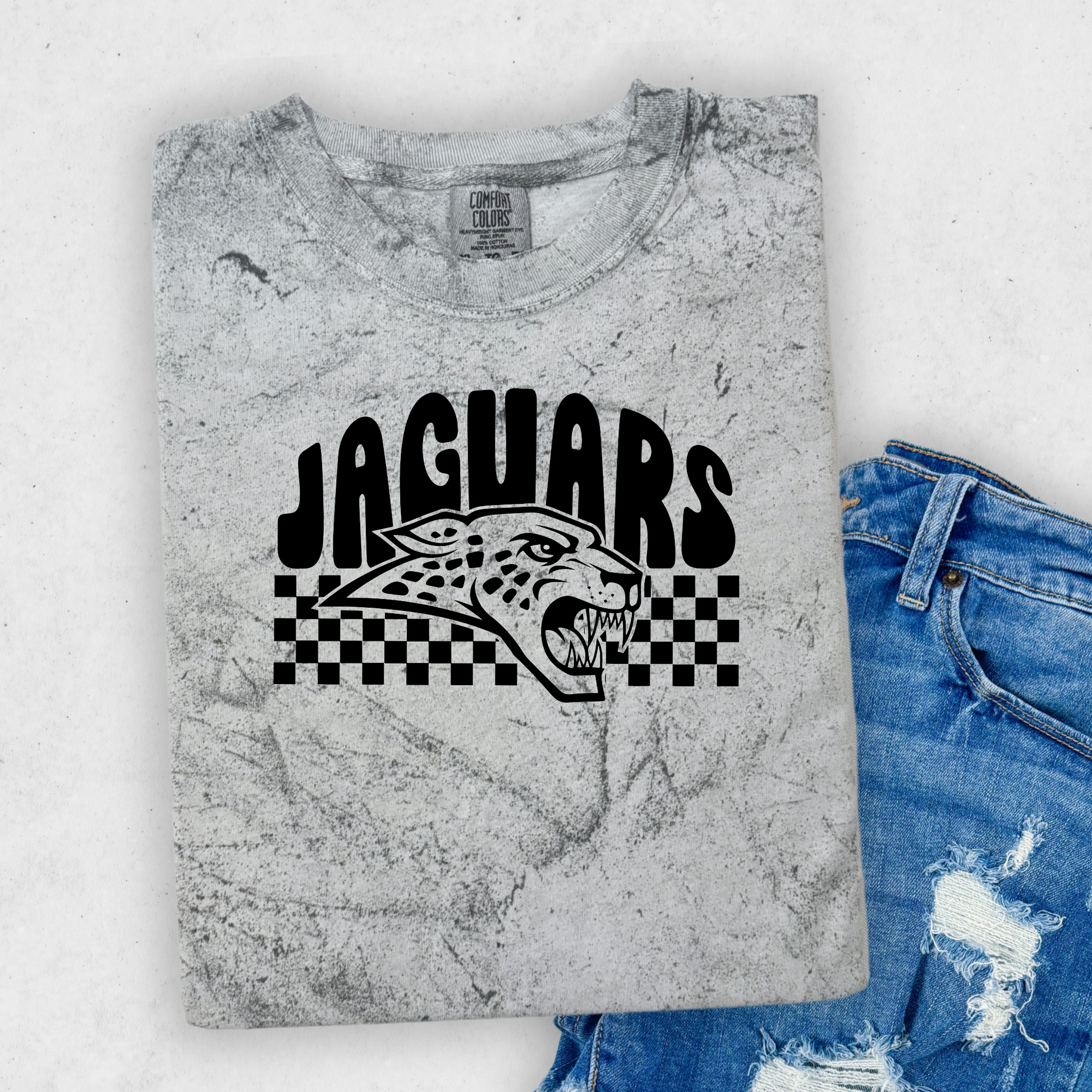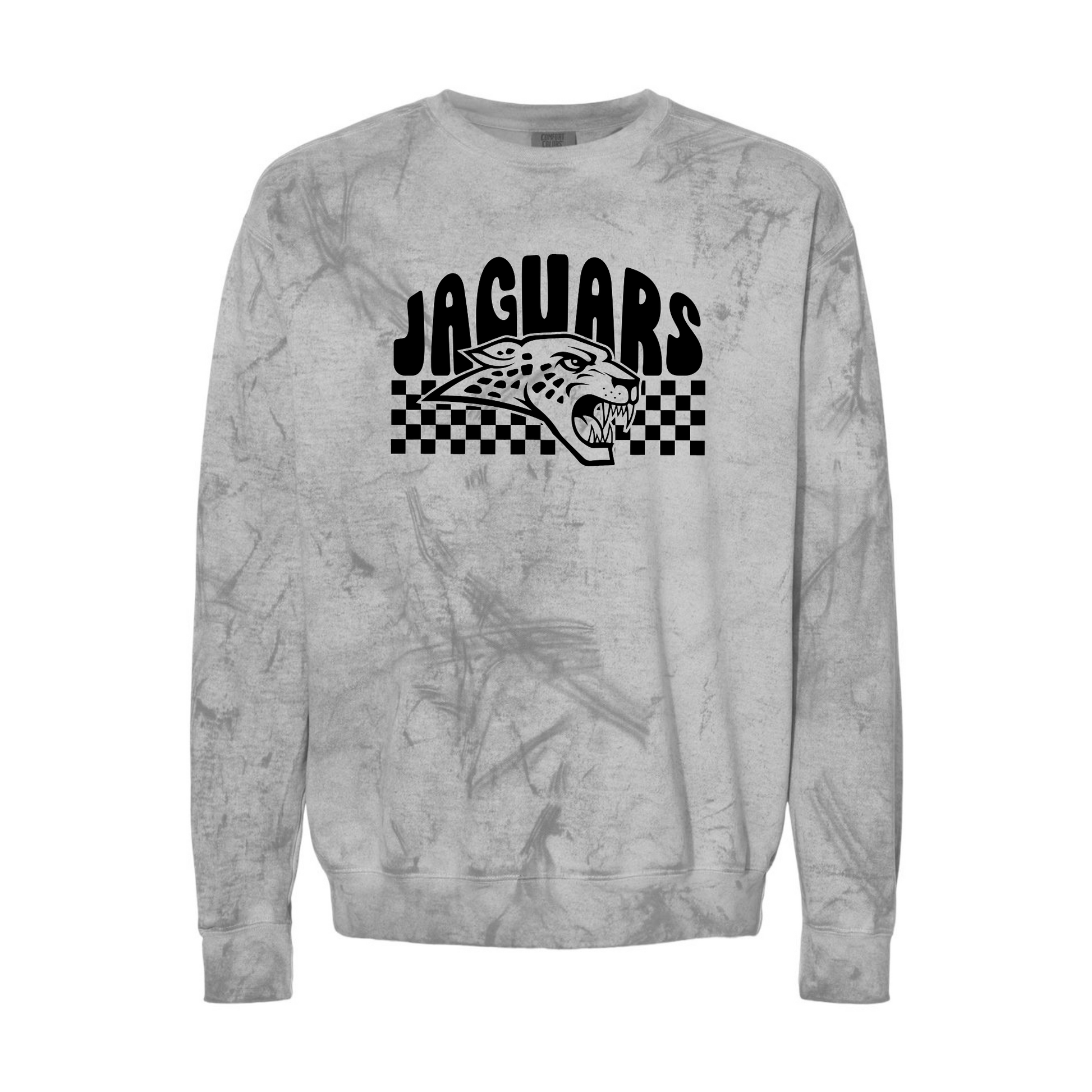 Celebrate school spirit with this cozy Comfort Colors tee and adult crewneck sweatshirt, featuring a fun wavy Jaguars design in bold black and white on a smoky colorblast background. Perfect for youth and adults alike, these soft, stylish favorites bring comfort and energy to any day. Whether you're cheering on the team or just showing your pride, this spiritwear adds a playful touch to your casual wardrobe.No youth sizes in the sweatshirt