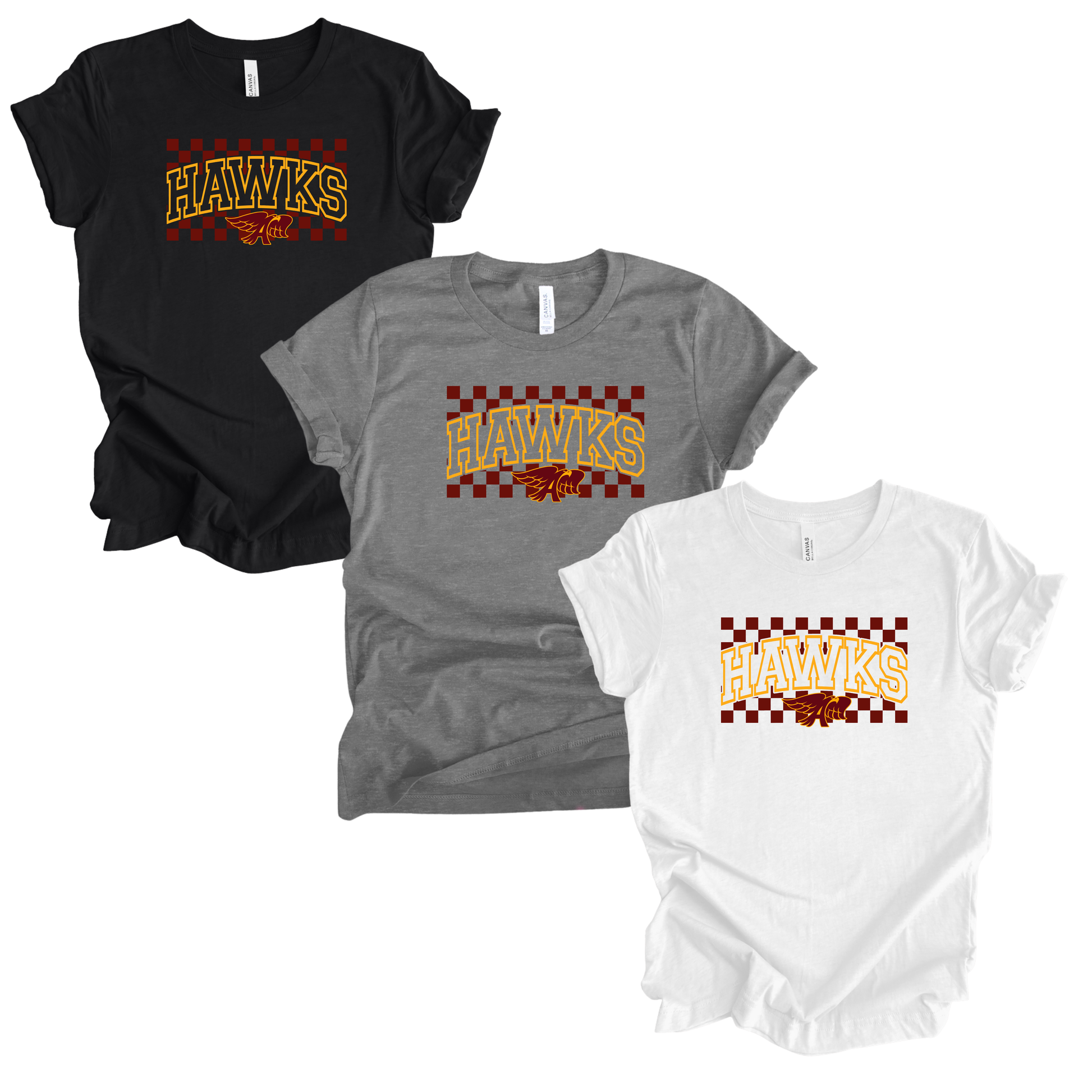 Show your school spirit any day of the week! This design features curved block “Hawks” lettering with a fun checker detail and the Hawk mascot underneath for a bold, spirited look.
