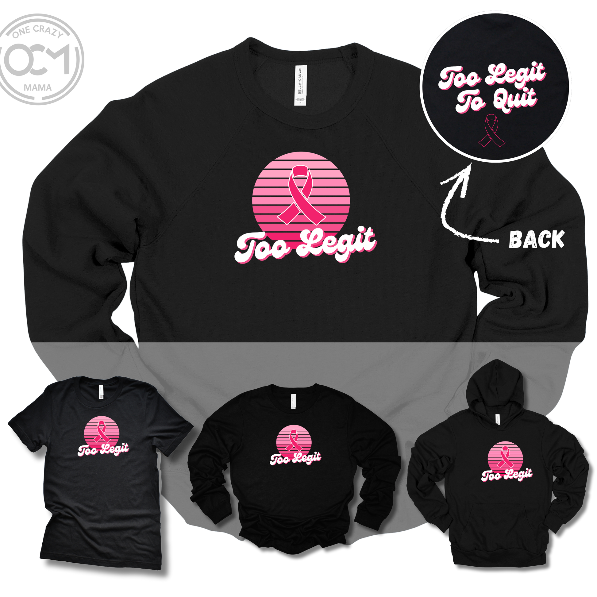 Show your support with our “Too Legit to Quit” apparel — created to uplift and encourage Leslie during her breast cancer fight. Choose your favorite style: short sleeve tee, long sleeve tee, cozy crewneck, or warm hoodie.