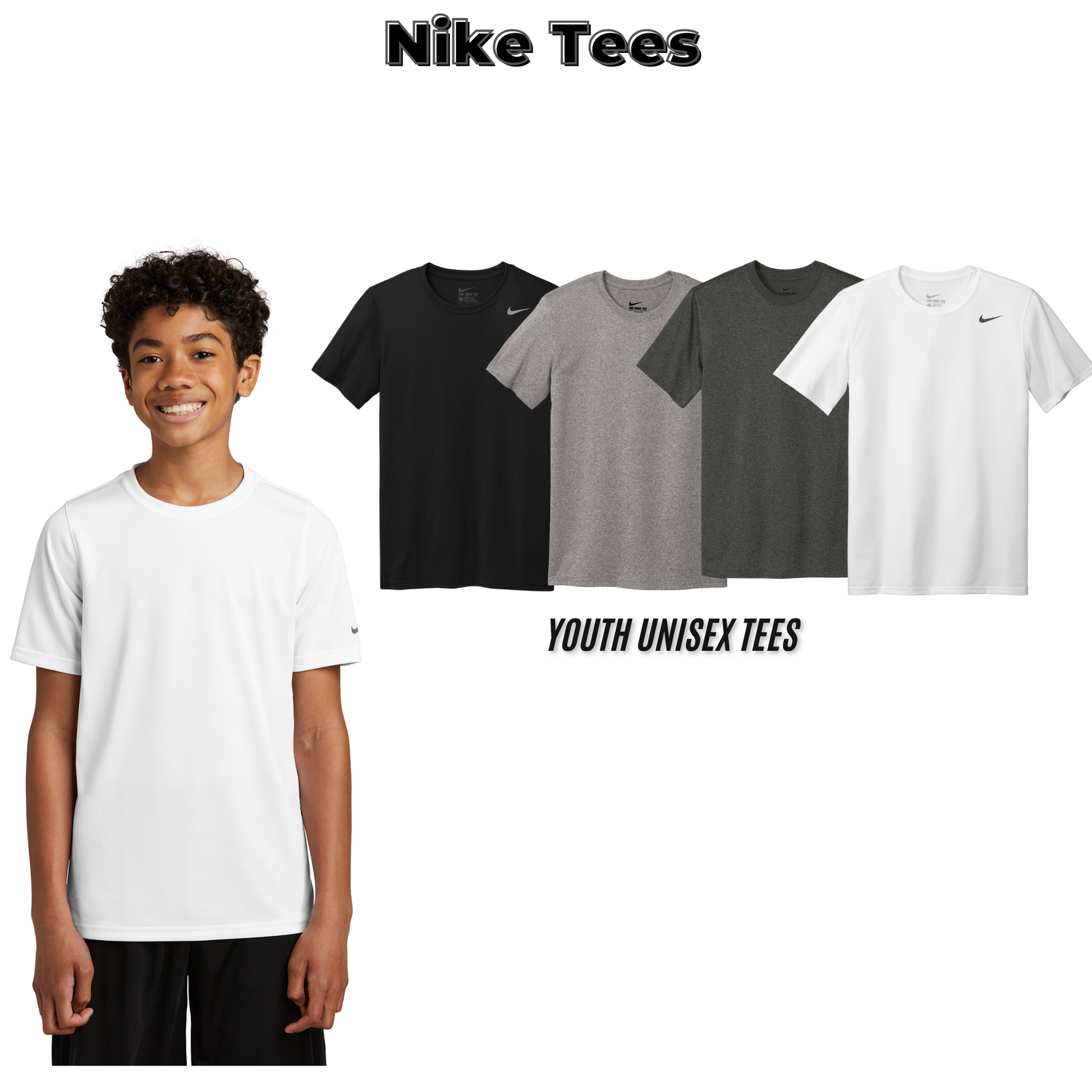 Stay cool, dry, and ready to cheer with these moisture-wicking Nike performance tees, designed for comfort and performance on and off the field. Available  in 4 color options — Black, White, Grey, and Dark Grey — and feature 3 full-front bold graphic designs or 3 left-chest logo styles